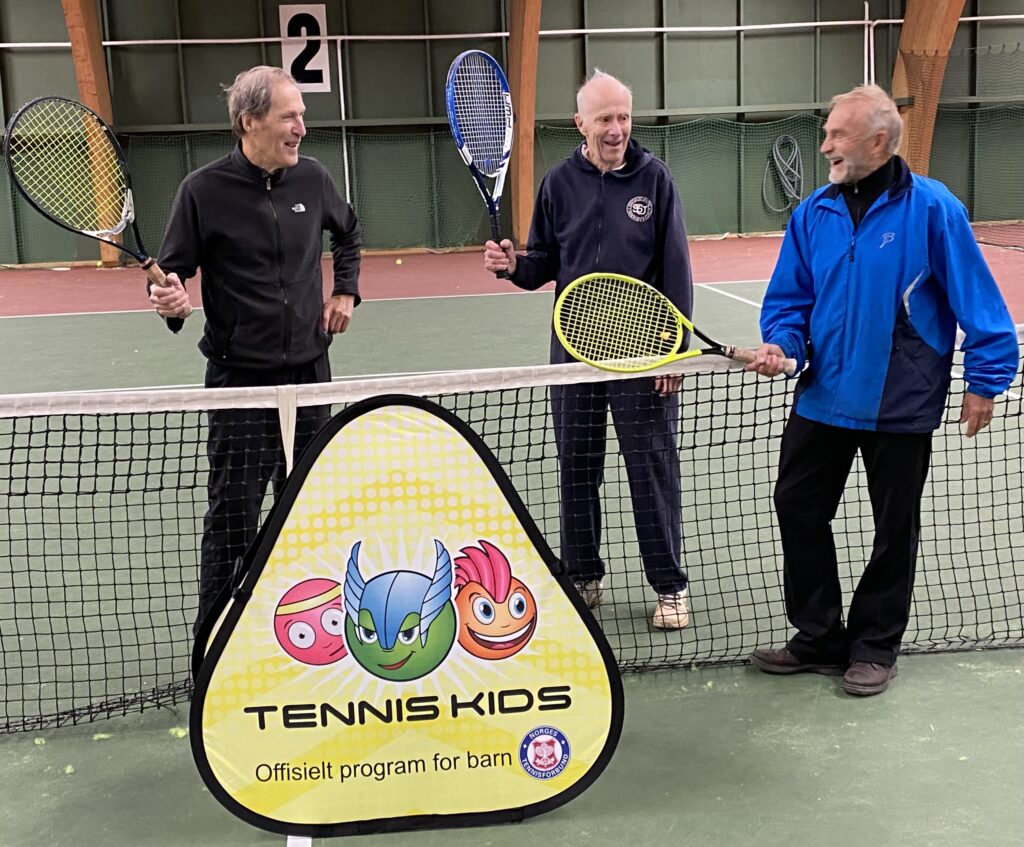 Vintersesongen er i gang, men "‘tennisbarna" går ikke i dvale. Innespill i Drøbak (fra venstre): Karsten Rånås 75 år, Geir Goffeng 87 år (tidligere leder Ås tennisklubb og leder av Akershus tenniskrets da kretsen ble etablert) og Birger Solberg (76).